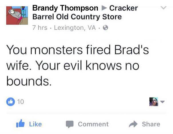 By being active on social media, customers are more likely to form relationships with the brand and may become a loyal customer. Communicating well with customers, will entertain them and allow them to form an attachment to the brand causing them to follow the accounts to keep updated on what the company is doing. Take the meme titled ‘brad’s wife’ according to know your meme.com (pictured below). The customer, Brad, openly complained about the unfair treatment of his wife to a restaurant called the ‘Cracker Barrel’. The meme allowed the company to gain a lot of attention due to the randomness of the comment and made a lot more people pay attention to their social media accounts so they could continue the meme itself. It developed a relationship with the customers and therefore gain customer loyalty due to the meme.